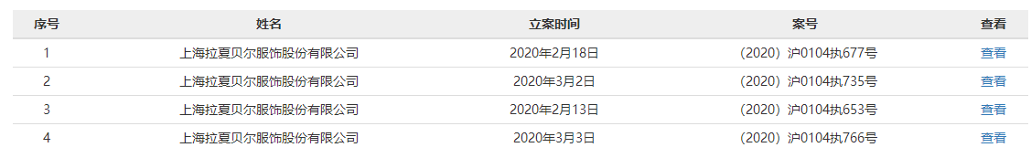 中國執(zhí)行信息公開網(wǎng)顯示,2020年3月2日、3月3日,拉夏貝爾連續(xù)兩日被列為被執(zhí)行人,執(zhí)行法院均為上海市徐匯區(qū)人民法院。其中,3月2日執(zhí)行標的為1545646元;3月3日執(zhí)行標的為2371821元。
